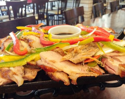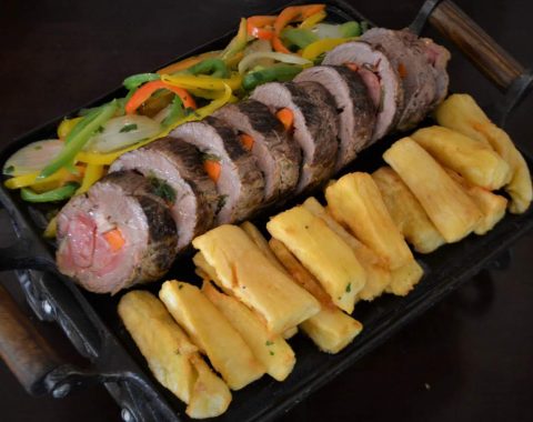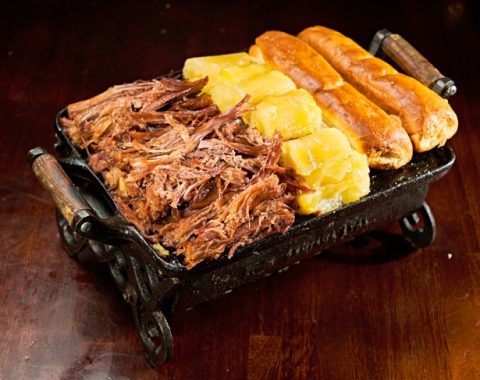 Pernil suíno assado e mandioca frita. Acompanha uma porção de pão, farofa e vinagrete.