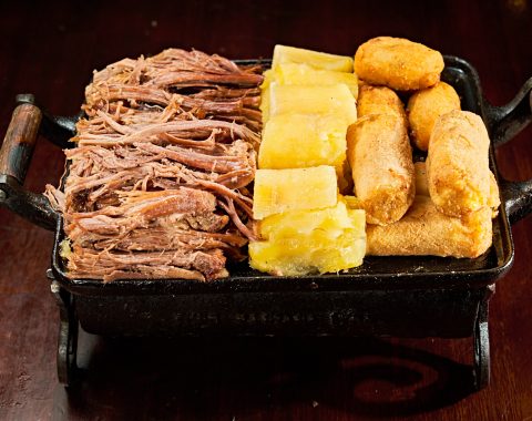 Costela desfiada com mandioca cozida ou frita. Acompanha uma porção de pão, farofa e vinagrete
