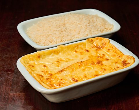 Purê de mandioca, recheado de costela e catupiry, coberto de parmesão gratinado. Acompanhado de arroz branco