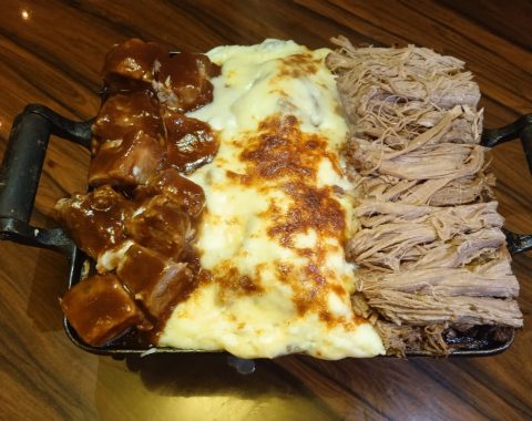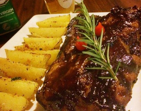 Costela recheada, costela no bafo e costelinha suína com cebola ao molho shoyu. Acompanha uma porção de pão, farofa e vinagrete