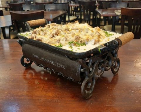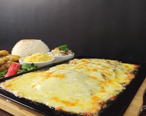 Costela com queijo cremoso gratinada com parmesão e palmitos. Acompanha uma porção de pão, farofa e vinagrete.