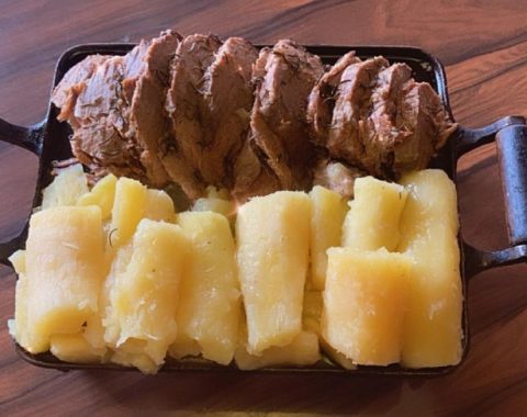 Cupim na manteiga com ervas, acompanhado de mandioca cozida.